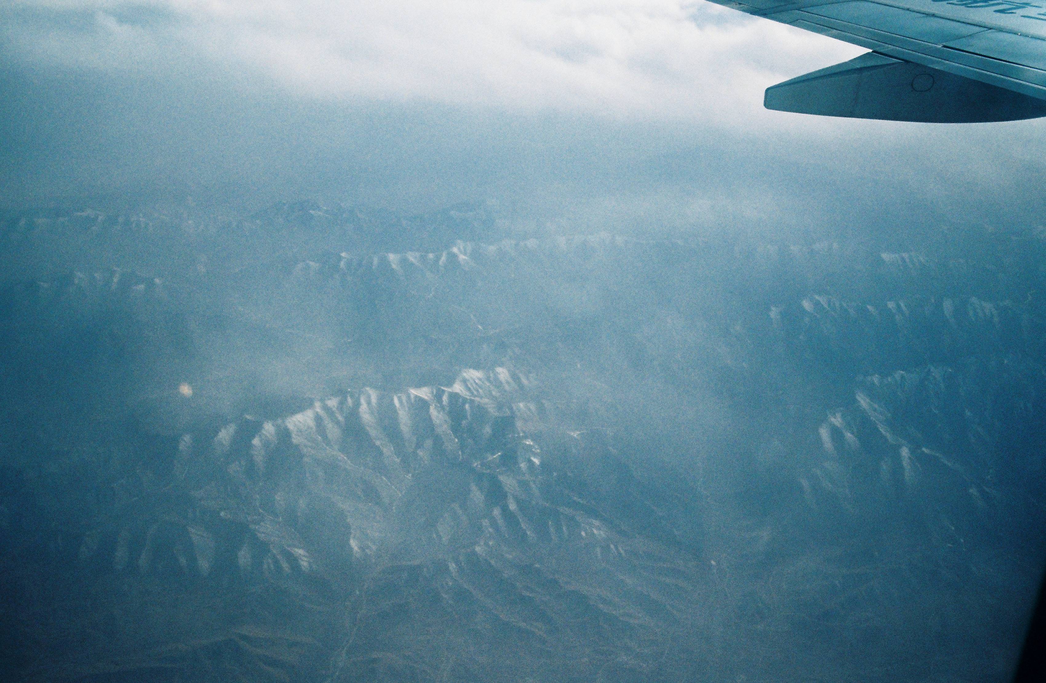 在飞机内往外拍摄的照片。窗户玻璃很脏,拍出来的效果是雾蒙蒙的。