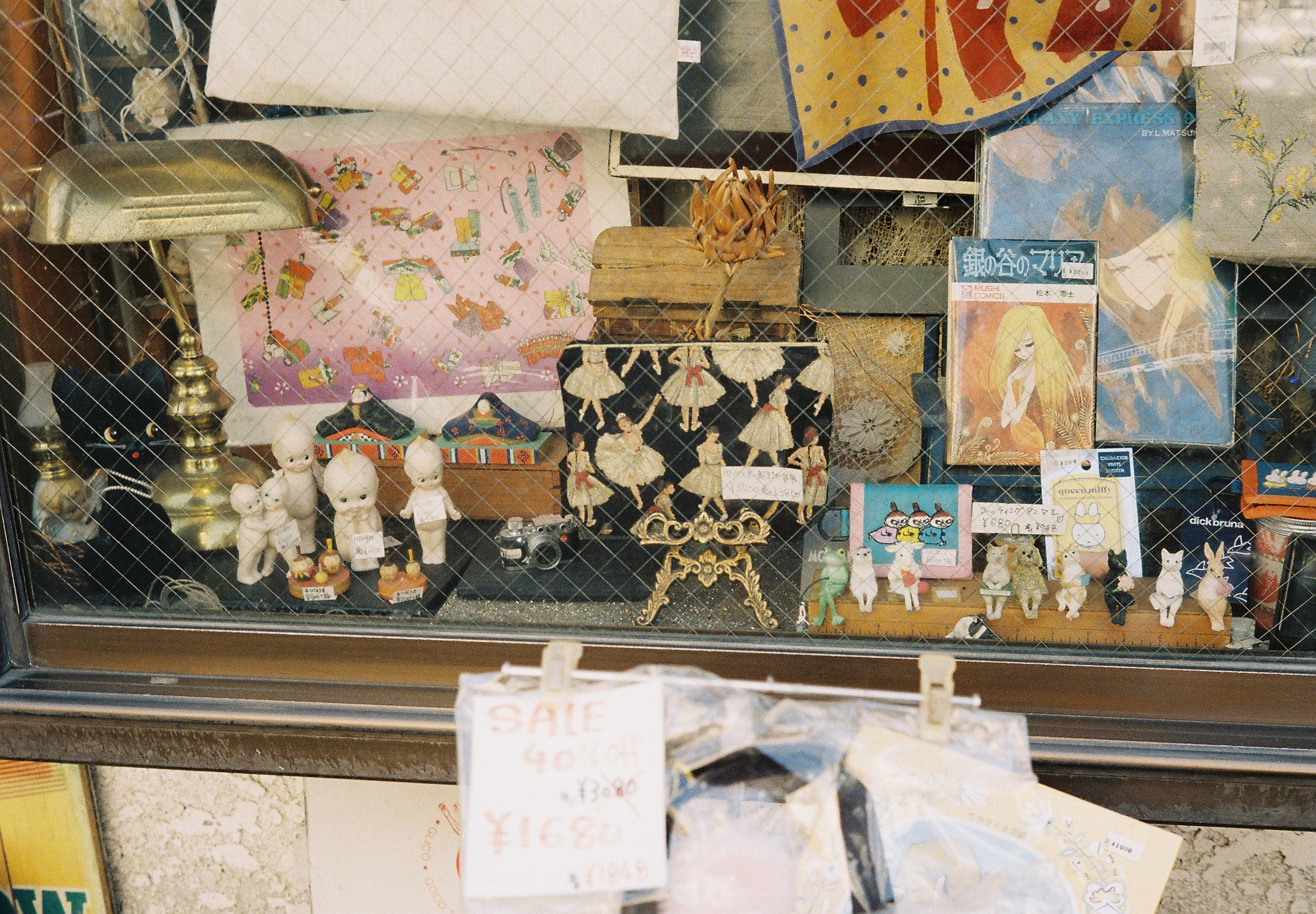 路过了一家卖古董商品的店,橱窗里头摆了一台胶片机(不知道是110相机还是只是模型),还有银河铁道999的海报。我只在外面拍了张照就走了,现在很后悔没进去看看。