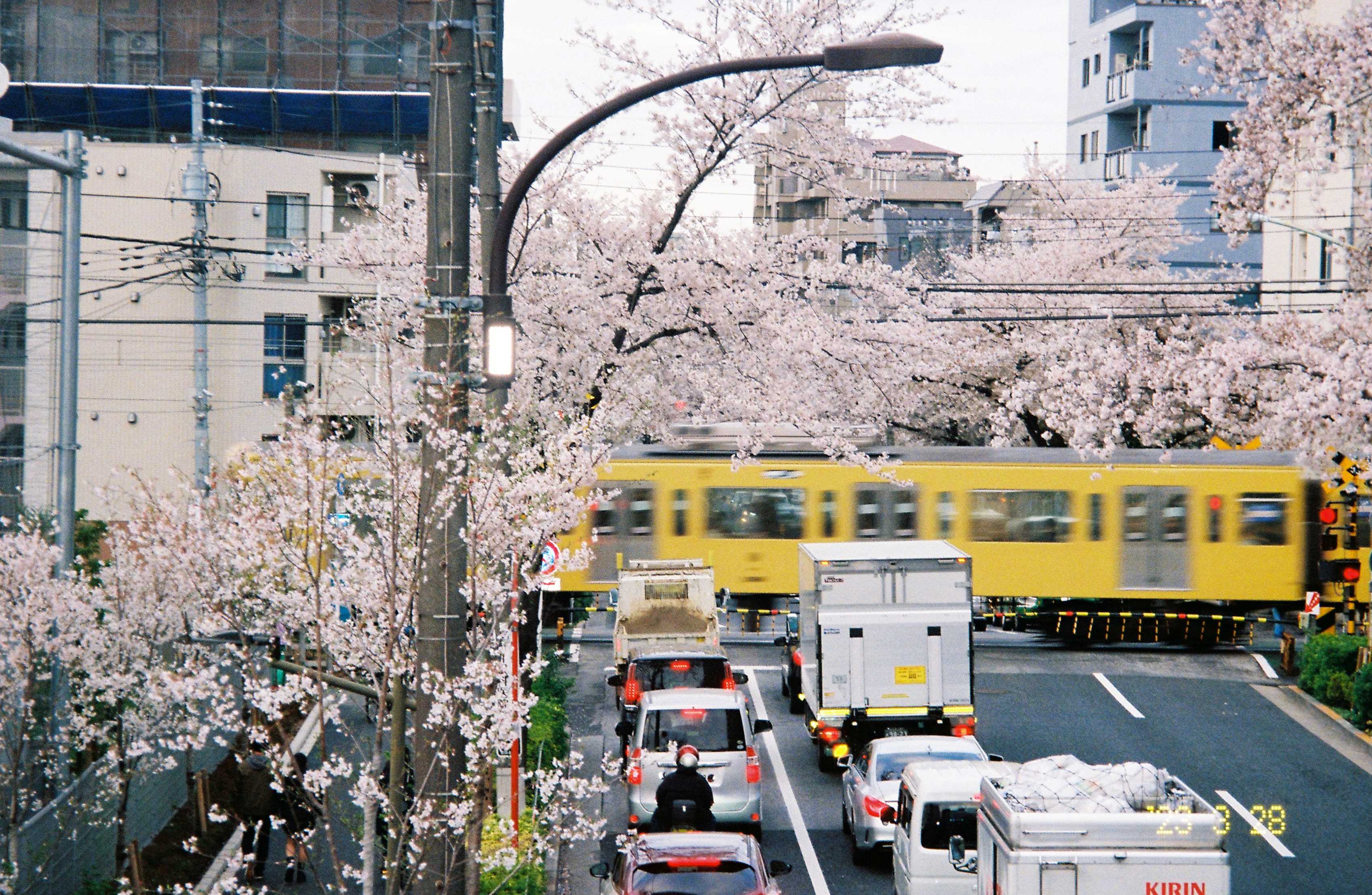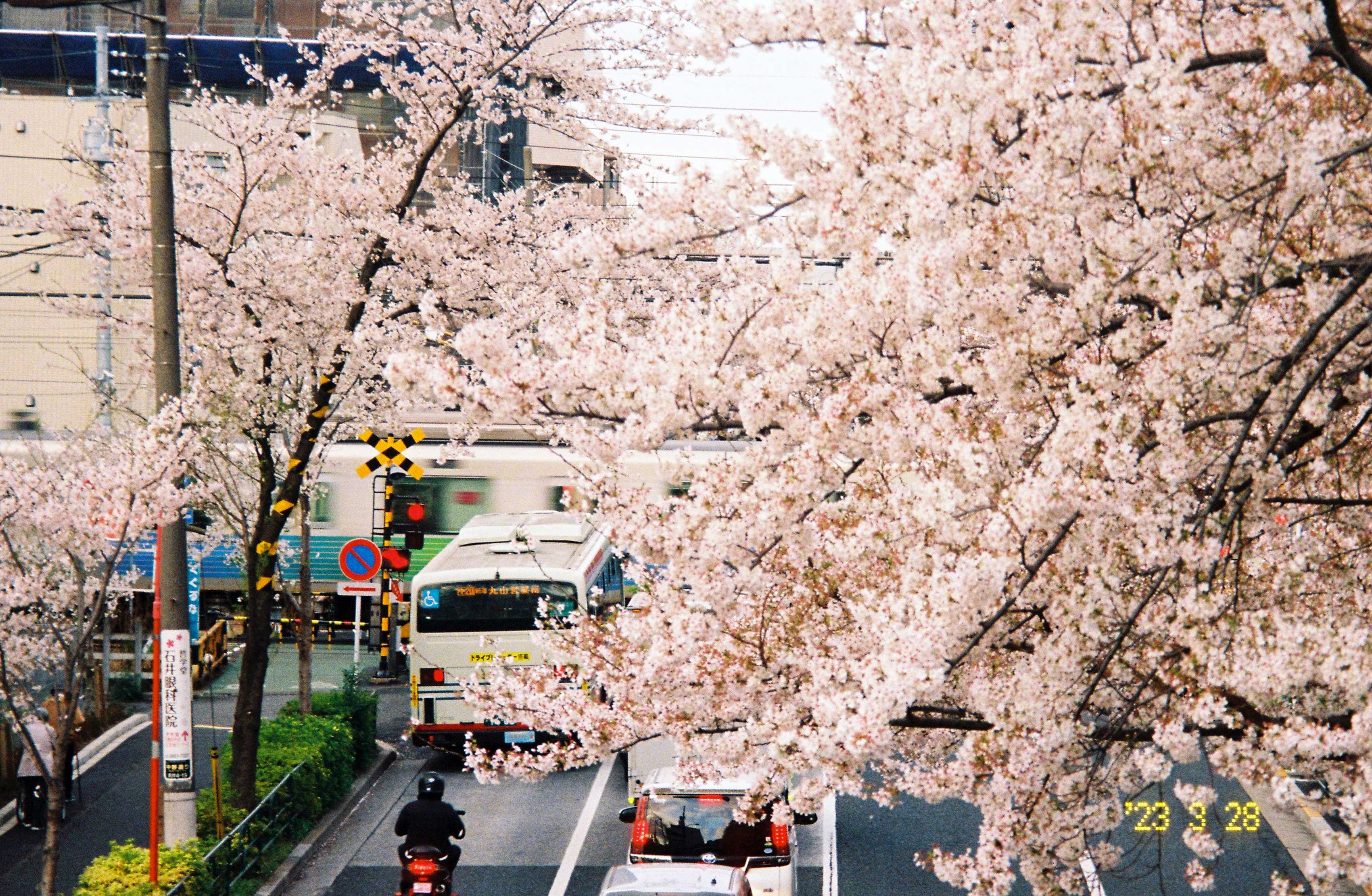 中野有一个据说能同时拍到樱花和电车的地方,在新井药师前站附近的一个天桥上,我去的时候已经是五点多了,有一群扛着长枪短炮的摄影师在这里等待电车开过。我掏出傻瓜机,蹲到了一位扛着长焦镜头的大哥旁边,把相机伸出栏杆拍了几张,当时忘记关闪光灯了,希望这位大哥原谅我的没素质。
