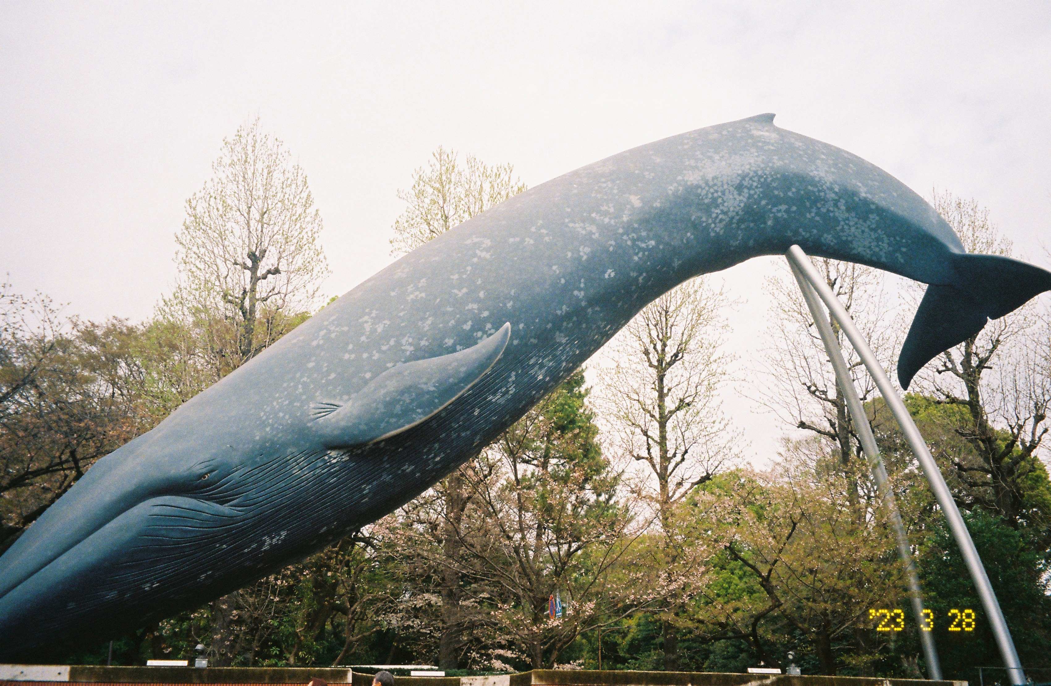 博物馆外面的鲸鱼雕塑。